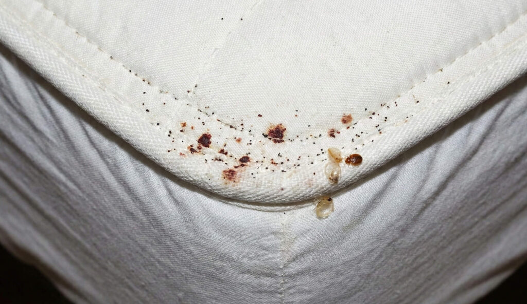 Les punaises de lit laissent derrière elles des déjections qui ressemblent à de minuscules points noirs, comme si quelqu’un avait fait des petits pointillés au feutre fin sur votre literie. Ces taches sont en réalité du sang digéré et se retrouvent principalement sur les draps, les taies d’oreiller, le matelas ou le sommier.